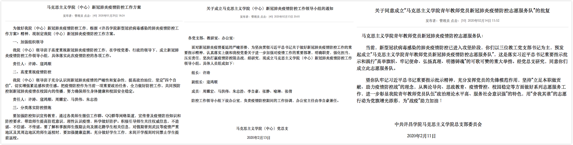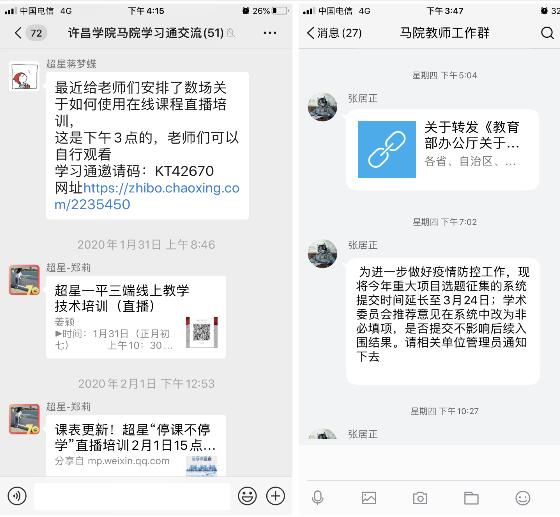 院党政班子统筹协调疫情防控期间的教学科研工作。2月15日,召开科级以上干部视频会议,传达学校党委会议和教务处视频会议精神,安排部署近期的教学、科研工作,要求广大思政课教师积极挖掘育人元素,以学习通为网络教学平台开展网络集体备课,精心准备上好开学思政第一课,努力做到“延期不延教,停课不停学”,确保思政课取得扎实成效;要求各教研室组织支持“双高”教师秉持科研强院理念,坚持停学不停研究、隔离不隔探索,持续加大科学研究,完成国家社科基金申报及相关科研工作。