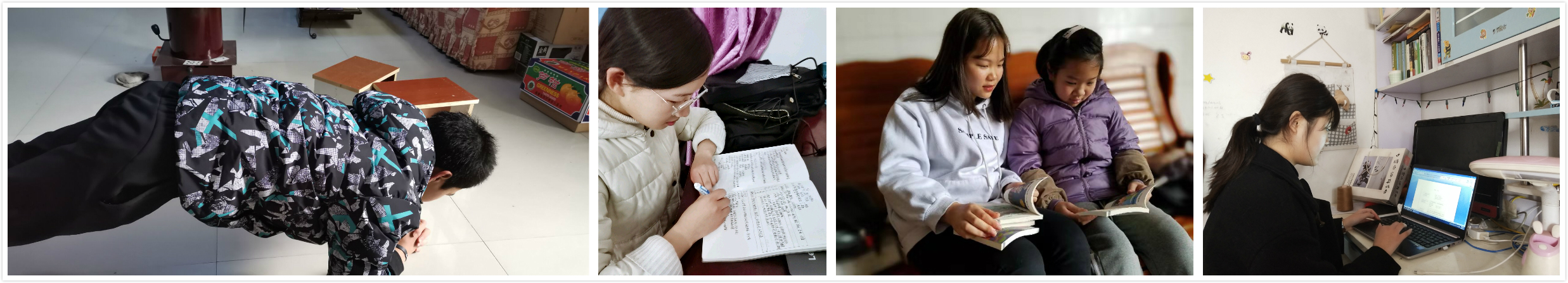 在辅导员老师的持续引导下,同学们情绪稳定,积极配合学校的各项工作,响应国家号召在家中有条不紊地进行各项活动。积极的开展相关网络课程的学习,做到停课不停学;在生活中主动帮助家人进行日常消毒,做家务;宅在家里参加“拯救寒假大作战”赢取社会实践学分;闲暇时间进行室内体育锻炼,学习烹饪,练习古筝、吉他等乐器,利用一切可以利用的时间来提升自己,用最好的自己来应对疫情、迎接春天的到来。