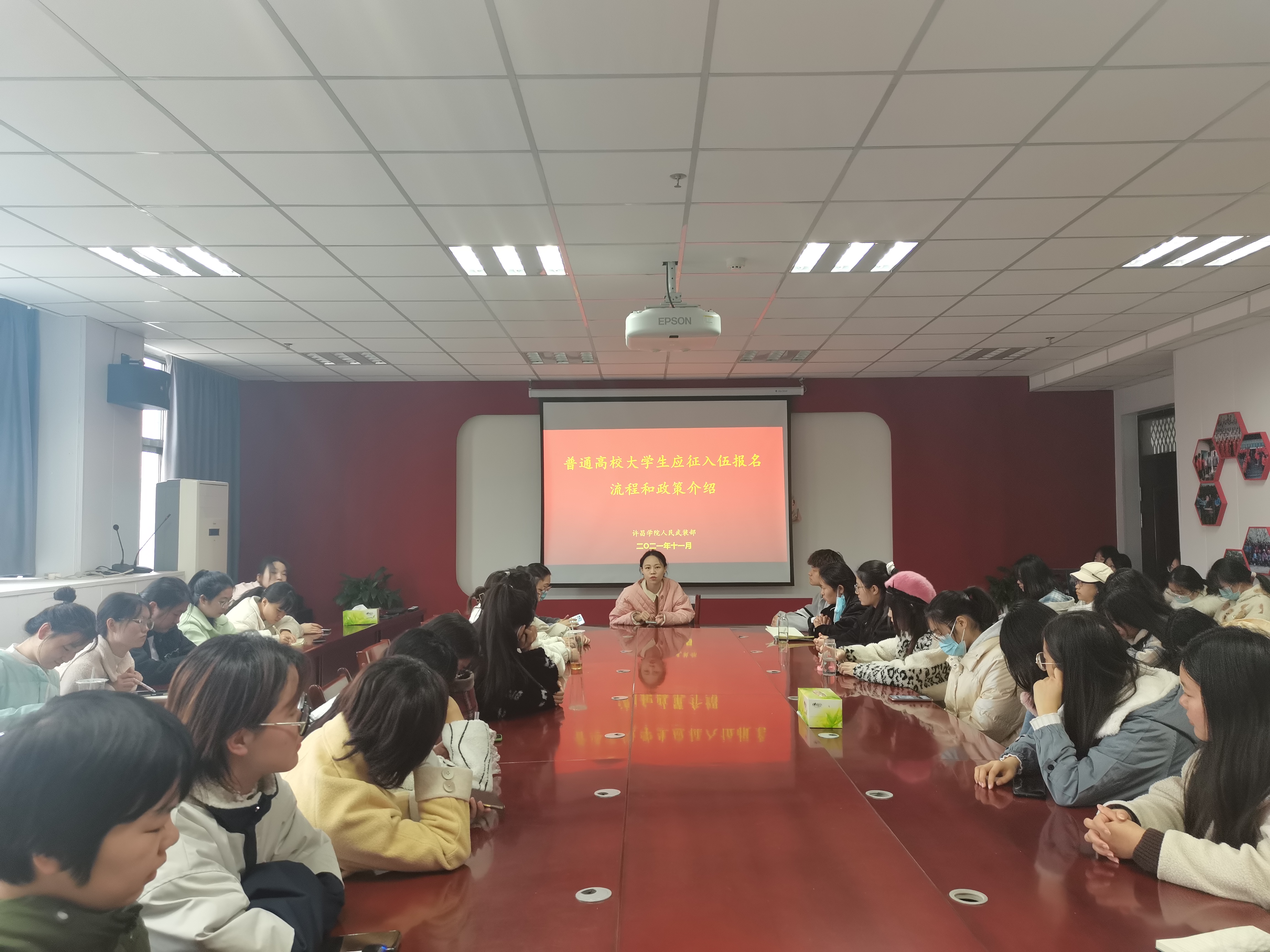 征集在校大学生入伍,是新形势下提高部队兵员素质、加强国防和军队现代化建设的重大举措。为响应国家号召、进一步做好征兵宣传工作,yL23411永利官网登录组织全体学生于12月8日上午9:00在文综楼1130进行了“应征入伍动员暨政策解读”宣传活动。