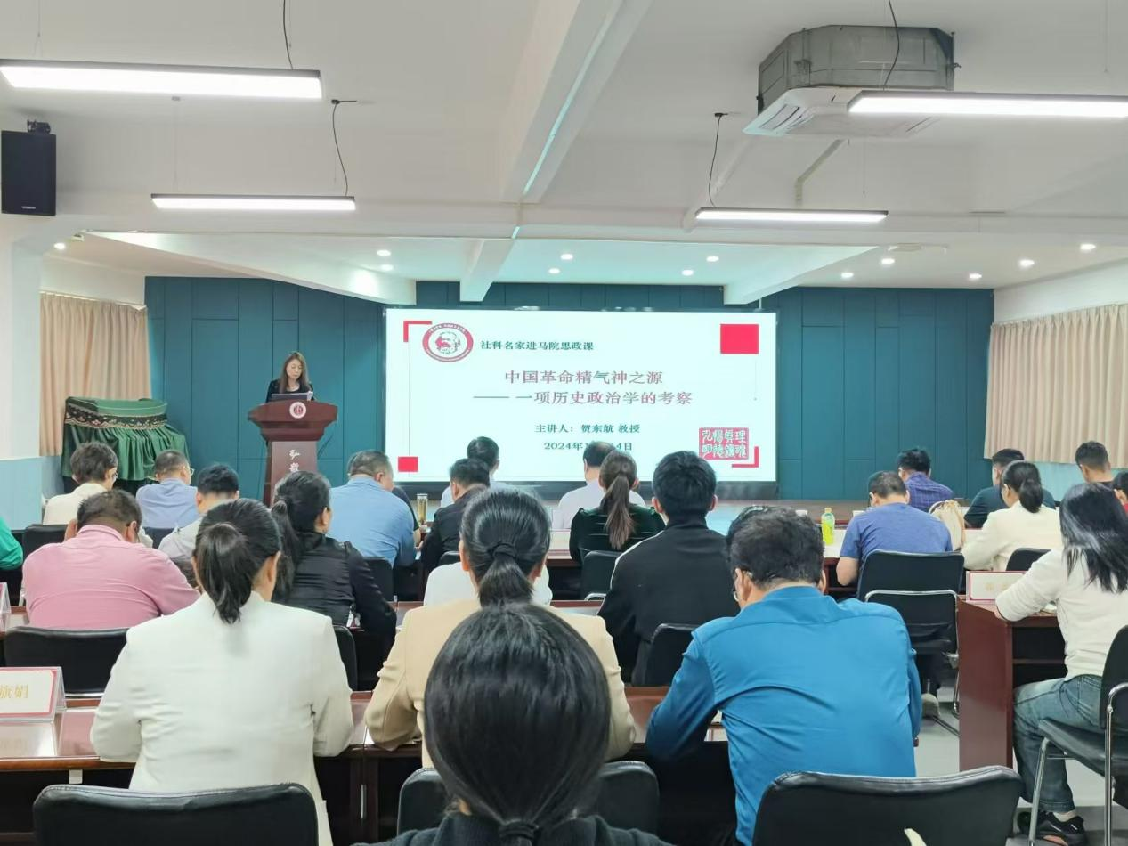 为进一步深入学习贯彻党的二十届三中全会精神,提升教师政治理论素养,10月14日下午,学校在弘毅书院举行“社科名家进马院思政课”活动。本次活动邀请到复旦大学贺东航教授,以《中国革命精气神之源——一项历史政治学的考察》为题向yL23411永利官网登录、文史与传媒学院、法学院、教育学院、商学院等5个学院的相关专业老师作报告。此次活动由yL23411永利官网登录党委书记谢依楠主持,60余名教师参加了本次活动。