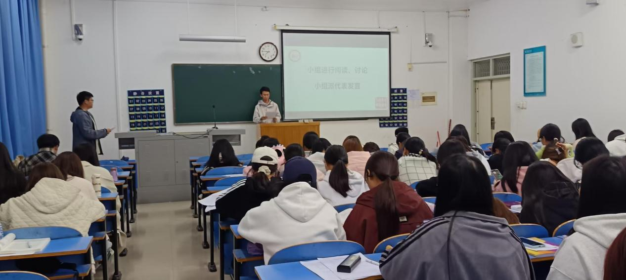 针对大二学生则需要在“思”上有所突破。随着专业知识的深入学习,他们开始思考如何将所学知识应用于实际问题中。同学们从历史、背景、内容要点及在新时代的价值和意义等方面深入浅出讲解了《国家与革命》,认清了资本主义的本质,增强社会主义国家的认同感;强调了推进国家治理体系和治理能力现代化及全面从严治党、加强执政党建设的必要性。通过对它的阅读和思考,让学生更深刻的了解马克思主义和无产阶级革命斗争和政权建设的普遍规律。同学们纷纷表示要坚持阅读经典文本,学会运用马克思主义经典作家的思想分析现实重大理论问题,通过深耕马克思主义经典文本,不断提升马克思主义理论素养。